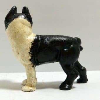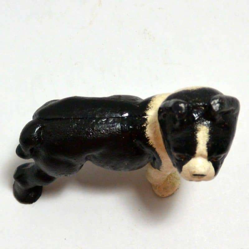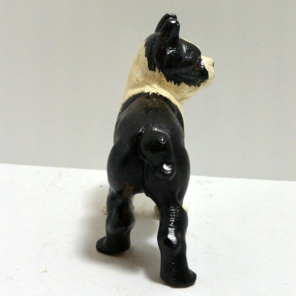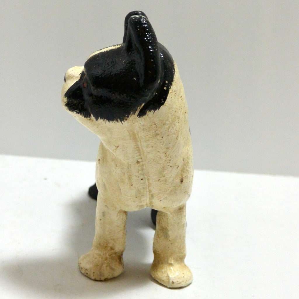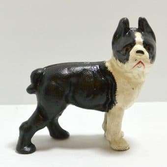 This adorable, cast iron Boston Terrier has been very well preserved. Measuring 4 1/2″ tall x 4 1/2″ long x 2″ wide, he is the perfect size to display alone on a shelf, or to use as a bookend.