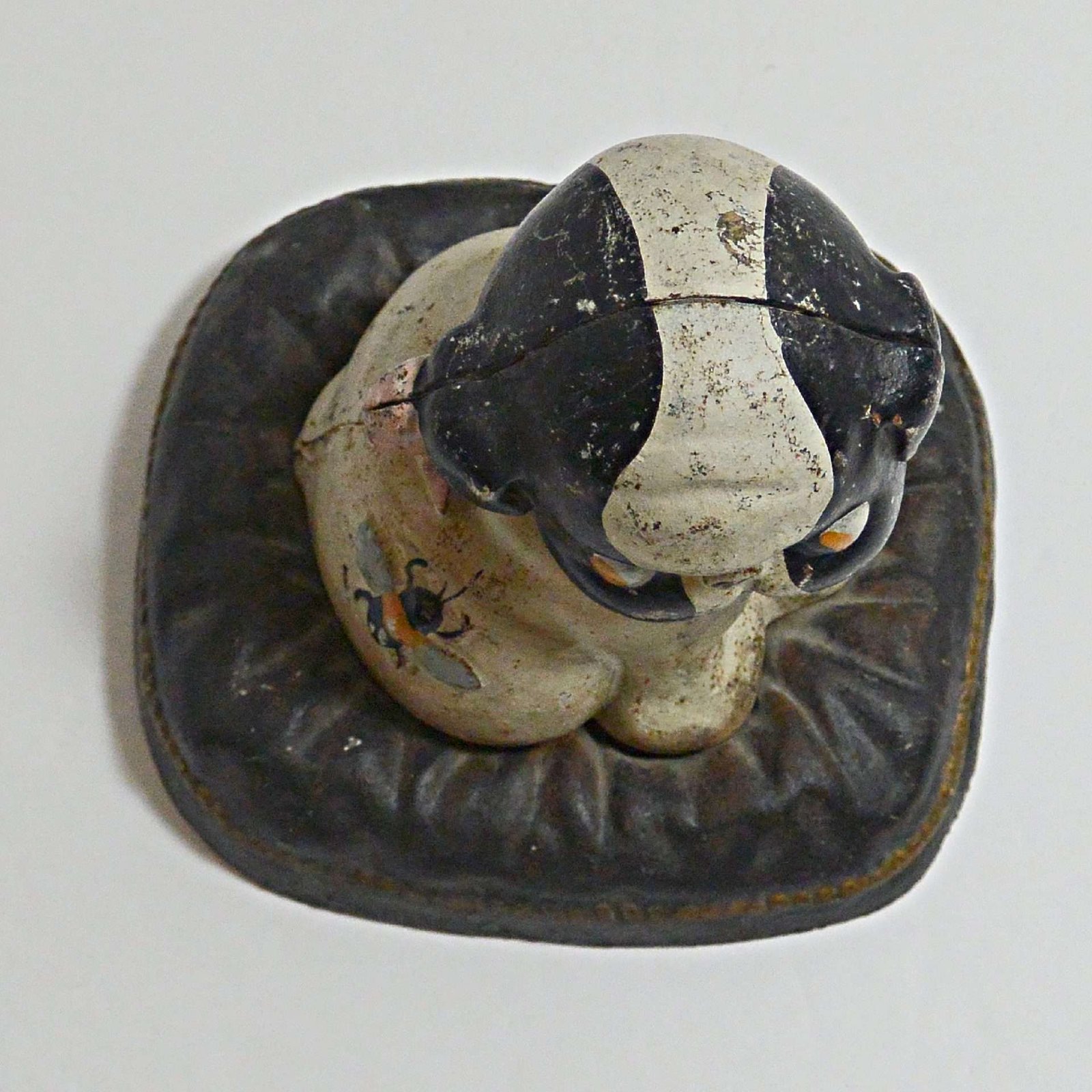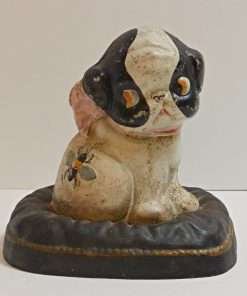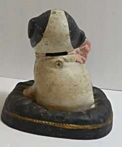 This “Puppo” still bank of a puppy is quite well-known. This sweet little puppy, sporting a big bow and sitting on a pillow, is looking, with great concern, over her shoulder at a bee that has landed on her.