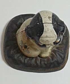 She measures 5 1/2″ tall x 5 1/2″ long x 4 1/2″ wide. Her painted has darkened and chipped over time, but it is all original paint, which adds to her value and vintage appeal.