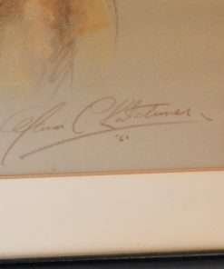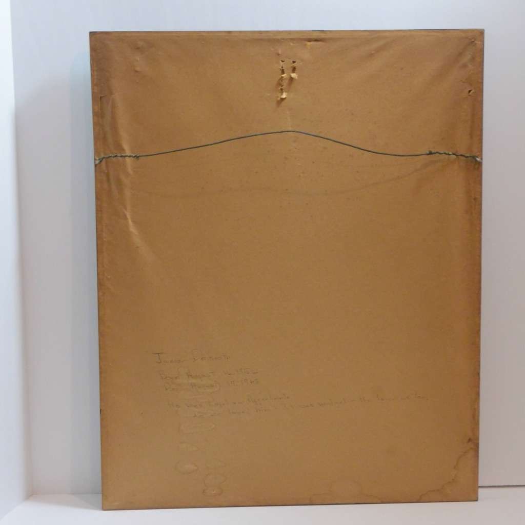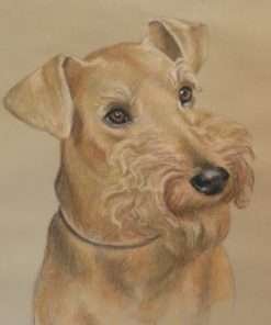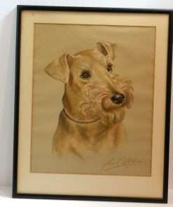 This wonderful portrait of an Airedale Terrier dog named “Junior” was done in 1961. Even though the medium used by the artist was simple, pastel chalk on craft paper, the portrait is very skillfully done, showing a dog who is both intelligent and lovable. It is 21″ tall x 16 3/4″ framed, and it is in great condition. There are three tiny specks up at the left hand corner, but they look to be on the inside of the glass and not on the portrait itself. There is a tribute, written in ink on the back which reads: “Junior Deisroth. Born August 16, 1956. Died August 19, 1968
