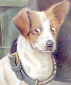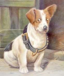 This whimsical, antique print was published in the 1908 edition of the children’s publication “Chatterbox”. Entitled THE MISFIT, it depicts a smiling, bright-eyed, Jack Russell Terrier, wearing a collar that is obviously way too big for him.