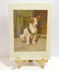 This whimsical, antique print was published in the 1908 edition of the children’s publication “Chatterbox”. Entitled THE MISFIT, it depicts a smiling, bright-eyed, Jack Russell Terrier, wearing a collar that is obviously way too big for him. It is in mint condition and the print itself is 7.5″ tall x 6″ wide. Within the mat it is 10″ x 7.5″. We show it on a small wood stand painted gold, which is not included. It would look amazing in a full frame under glass. Anyone who owns a “Jack” would appreciate the title’s play on words, and would completely enjoy this wonderful print as a gift!