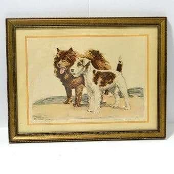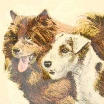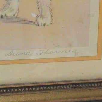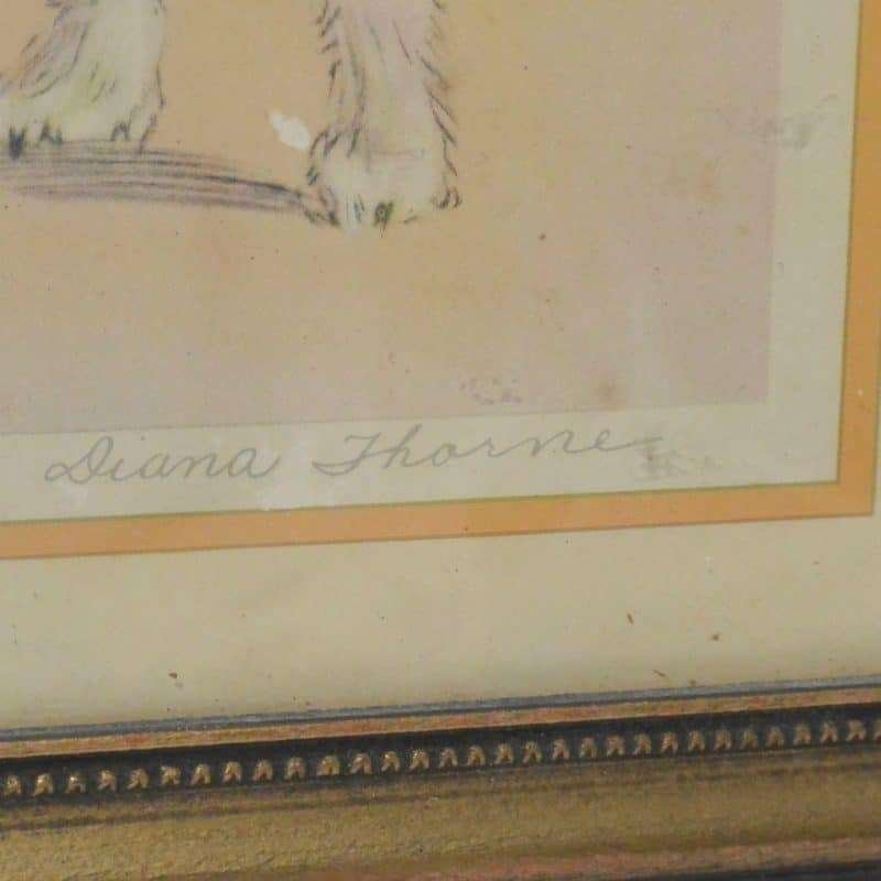This excellent, vintage artist-signed print was done by the well-known author/illustrator of over 50 books, Diana Thorne (1895 – 1963.) She was a dog owner and enthusiast who was able to capture the humor and energy that dogs often show when interacting with humans.