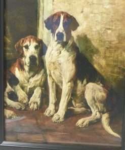 This interesting print is a cropped version of the original painting by John Emms entitled “Hours of Idleness, Hounds in a Stable.”