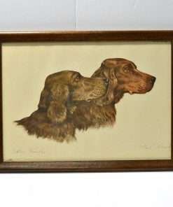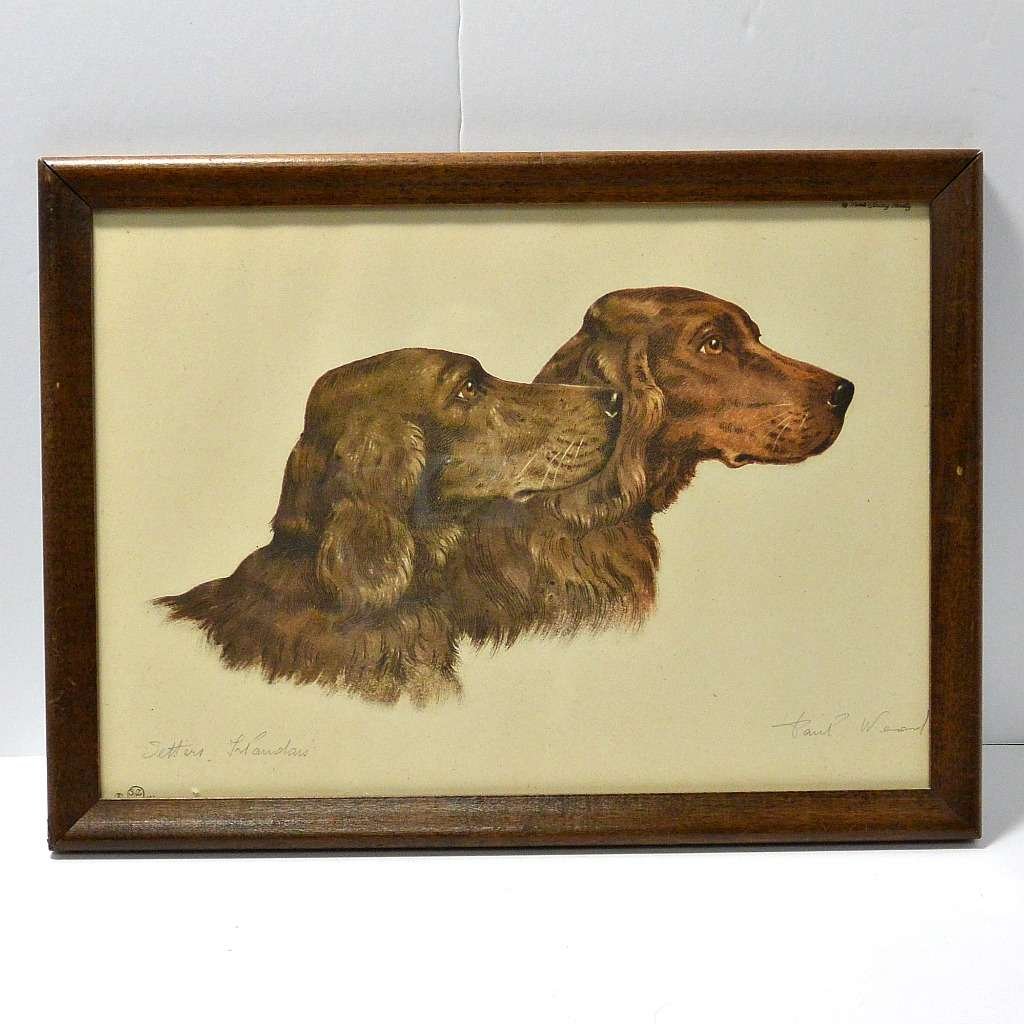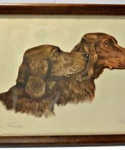 This wonderful portrait of two Irish Setter dogs is an etching done by Paul Wood in c.1935. It is called an aquatint etching in that it has a color tint, which in this case, is the breed’s characteristic mahogany color.