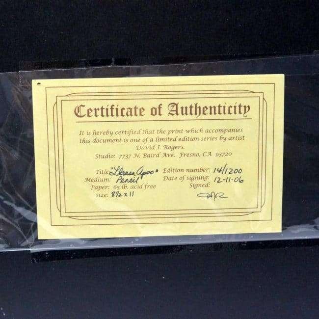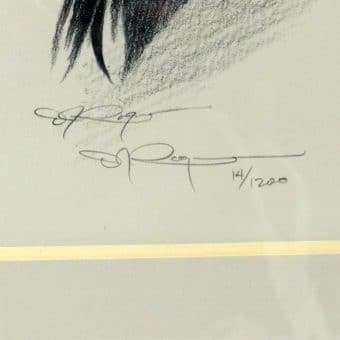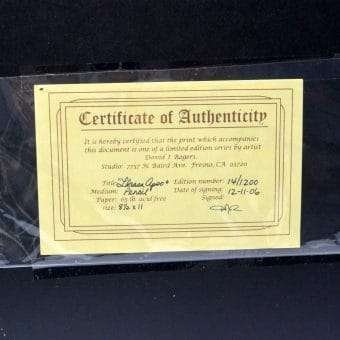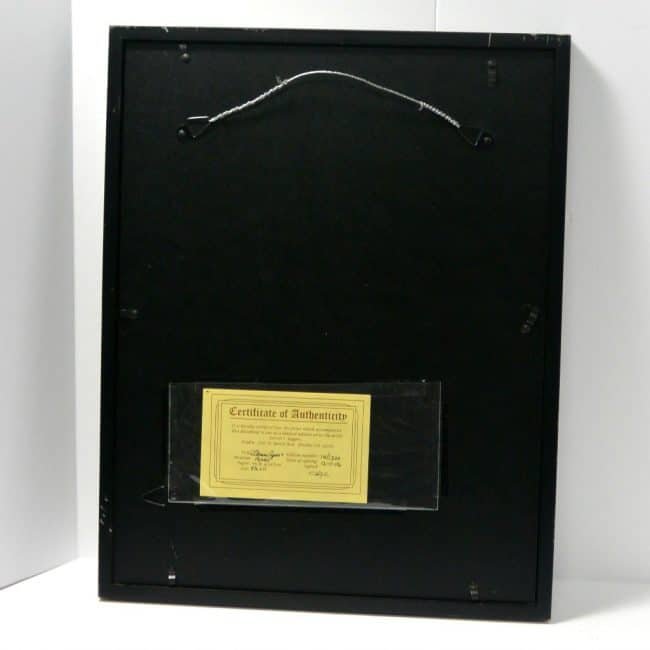 It was pencil-drawn and signed by David J. Rogers., and it was done as a limited edition series by this artist. It is is in excellent condition, matted and framed (in a black metal frame), under glass. It measures 19″ tall x 15″ wide, and it comes complete with its certificate of authenticity.