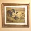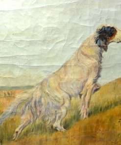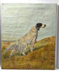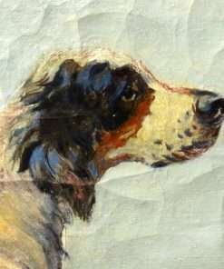 This original, gorgeous full body portrait of a Setter dog was done with oil paints on a stretched burlap canvas. The colors are vibrant, and the detailing of the dog’s fur and face is exquisite. The use of paint on the burlap gives this wonderful portrait a texture that adds to the realism of the piece.