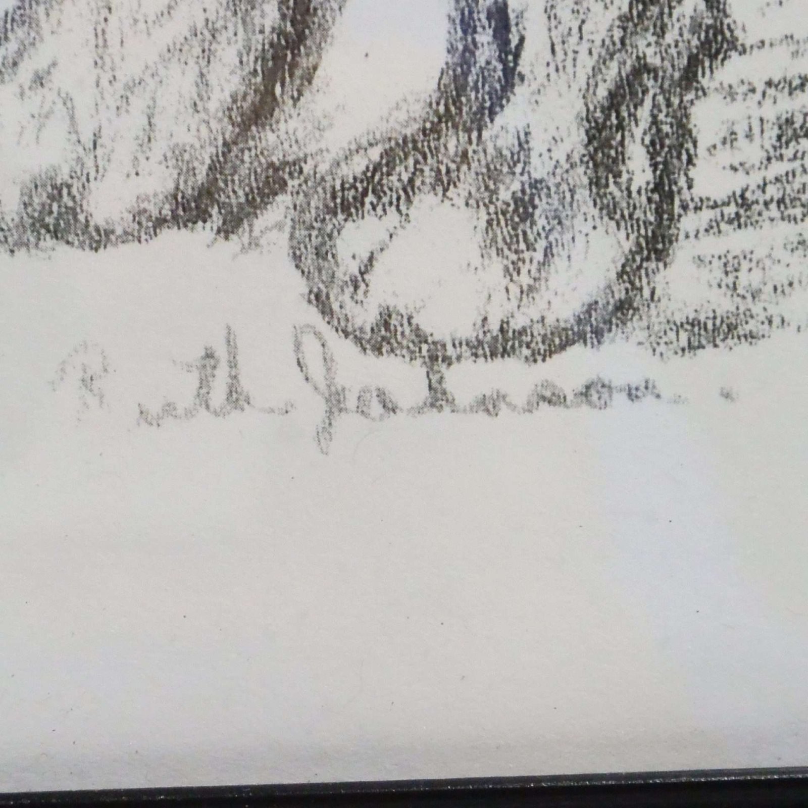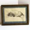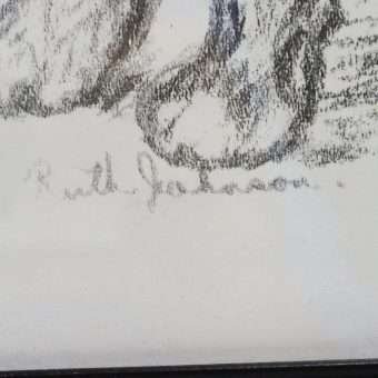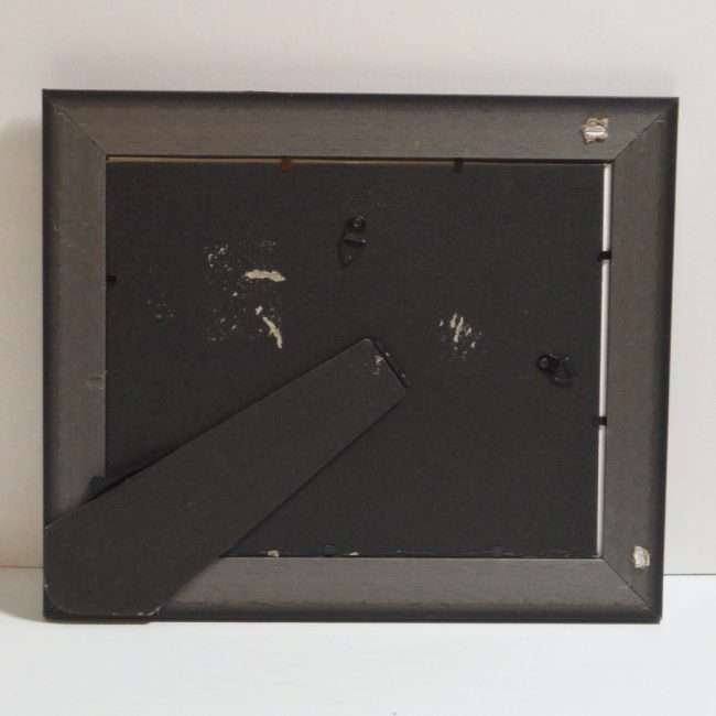 Measuring 10 1/2″ tall x 12 1/2″ wide, it is framed under glass in a light weight black frame.