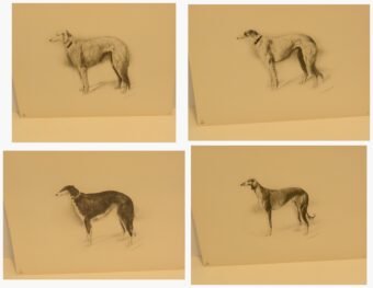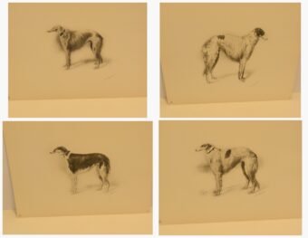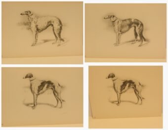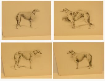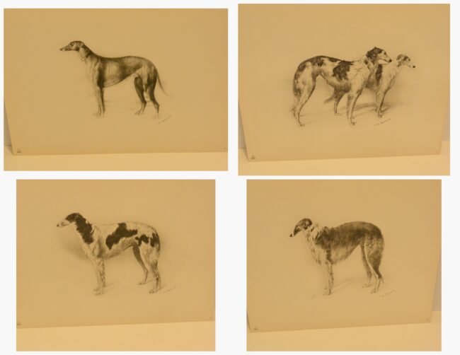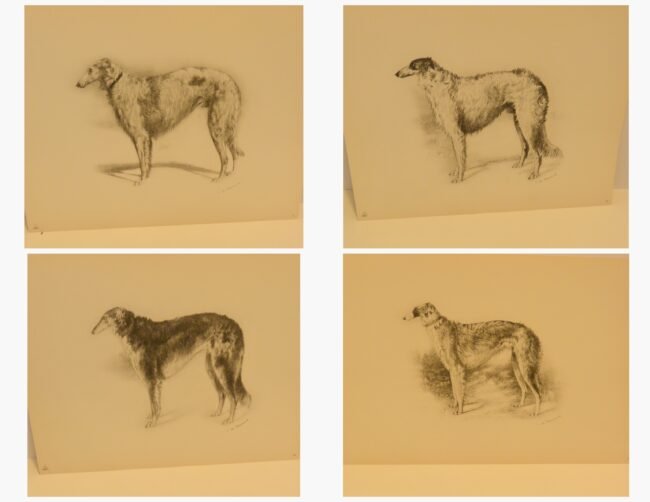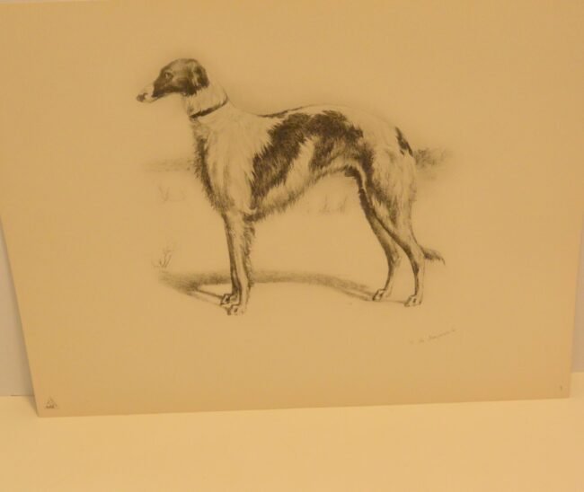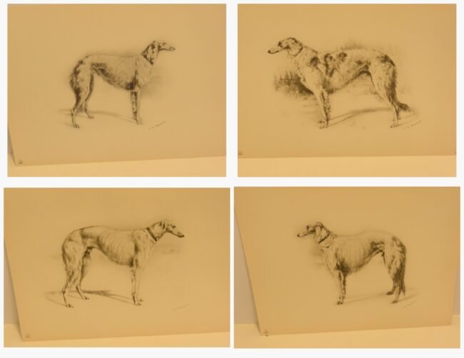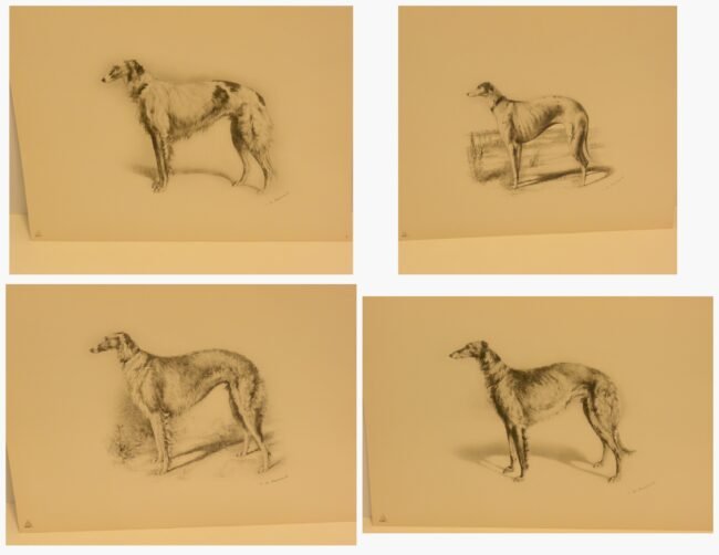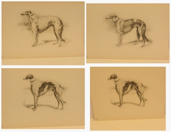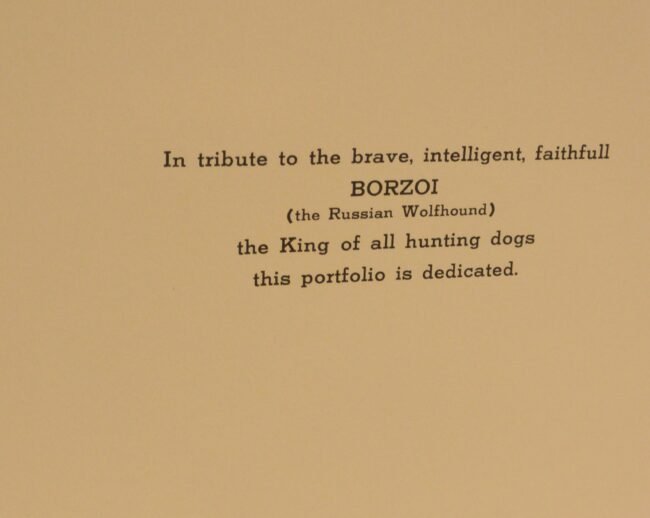 Immerse yourself in the grandeur of the Russian Imperial Court with this exceptionally rare complete portfolio of Borzoi dog lithographs. Published in 1934 in a limited edition of only 300, this set, titled “Portraits of Borzois,” is a sophisticated tribute to the legendary Russian Wolfhound.