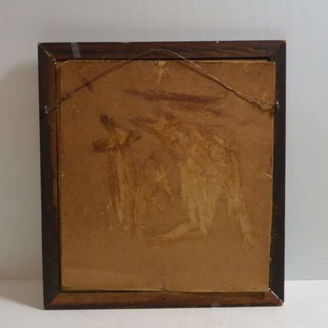 Done in pastels on board, it measures 12 1/2″ tall x 11 1/2″ wide. It is framed under glass in a dark brown wood frame, that has a few minor chips and a few splatters of white paint on it.