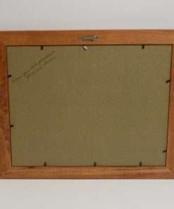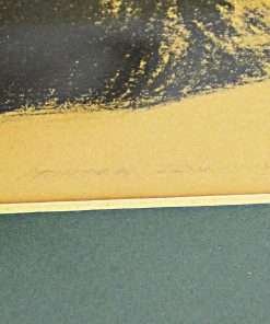 Measuring 16 1/2″ tall x 13 1/2″ long, it is in excellent condition. This vintage print is artist-signed, matted with a deep forest green and framed under glass, in a simple wood frame. The frame is also in very good condition. The combination of the deep green matte, and the medium wood tone of the frame look wonderful together.