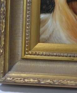 This magnificent painted portrait of a Yorkshire Terrier dog captures both her delicate appearance and her bold spirit. Exquisitely detailed and expertly realistic, you feel as though you have certainly met her before. To add to the beauty of this canine art, she is framed in a very heavy, solid wood, gilded frame that is 16″ x 18″ and 2 3/4″ thick. The entire piece is in mint condition, and it is signed by the artist.