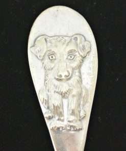 This sweet silverplate baby fork was made by Winthrop Industries in Hauppauge, N.Y. It has a cute terrier puppy pattern on the handle. At 4 1/2″ long and 1″ wide, it is in good vintage condition with some wearing of the silver. It is stamped “Winthrop Silverplate” on the back of the handle. This beautiful fork is a treasure to collect. It would also make a unique addition to a baby shower or christening gift, or to have on hand to offer to your grandchildren.