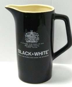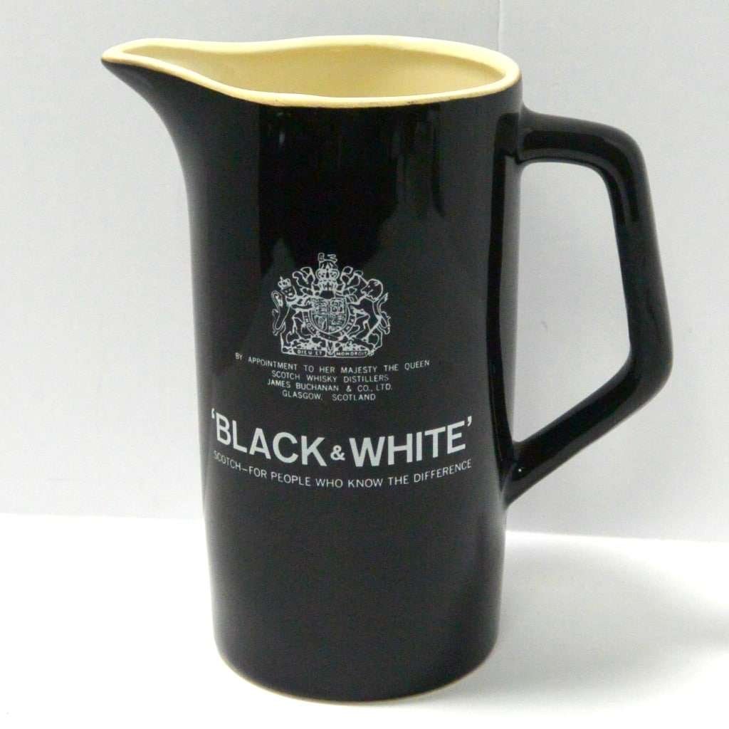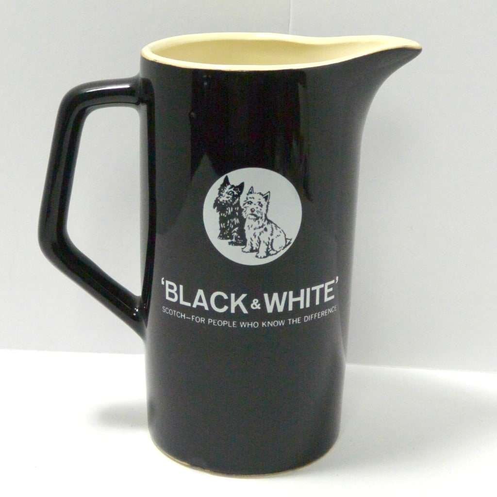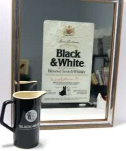 This wonderful, vintage, Black & White Scotch framed mirror and pitcher are being sold as a set. Designed for Heublein, Inc. as advertisements for their well-known “Black & White Scotch”, they make the perfect pair to dress up your bar, or “man-cave.”