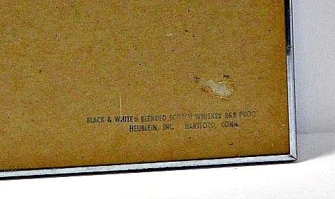 The mirror is a full 20″ tall x 16 3/4″ wide, it is framed in a silver/gold painted frame, and it is excellent condition. It is stamped on the back “Black & White Scotch Whiskey Heublein, Inc. Hartford, CT.”