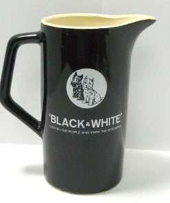 This wonderful, vintage, Black & White Scotch framed mirror and pitcher are being sold as a set. Designed for Heublein, Inc. as advertisements for their well-known “Black & White Scotch”, they make the perfect pair to dress up your bar, or “man-cave.” For us, it’s all about the dogs…that wonderful black Scottish Terrier, and his pal, a sweet white West Highland Terrier. They appear on both the mirror, and the pitcher.