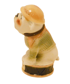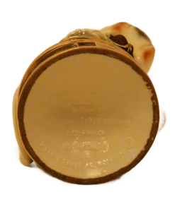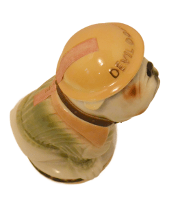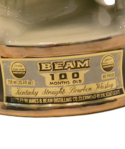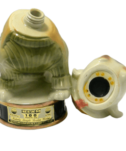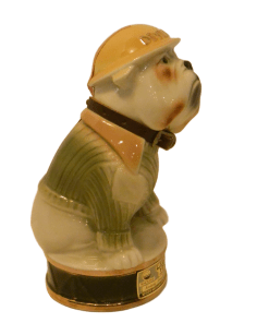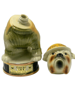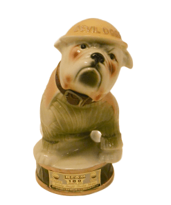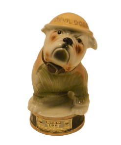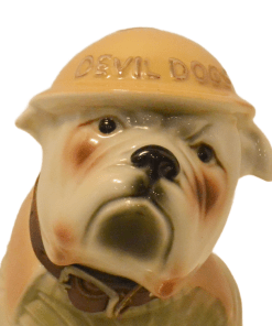 Here’s a fantastic Jim Beam Bulldog decanter that is not only amazing to look at, but it also carries a bit of history with it! This very cool looking bulldog decanter is wearing a Marine green sweater with khaki lapels, and has a drum leather, studded collar. He is also wearing a helmet with “Devil Dogs” written across the front. According to Marine folklore, the name “Devil Dogs” was given to the Marines by the Germans, as the result of fierce fighting in 1918 by the Marines in France’s Belleau Wood. The dog’s collar was probably added as a reference to the name “Leathernecks”, given to the Marines, which initially referred to the thick leather collar that was part of the Marine uniform from 1798 – 1872. This wonderful decanter is in excellent condition with its original label on the front of the base, and the label , broken, but still in great shape, on the back of the dog’s helmet. The decanter is empty, and clean. It would make an extraordinary gift to anyone who has served proudly in the Marines. As a decorative piece, standing 10″ tall x 5 1/2″ wide, it would add polish and class to any bar or decanter collection.