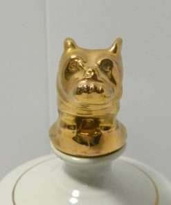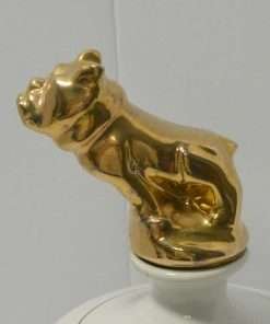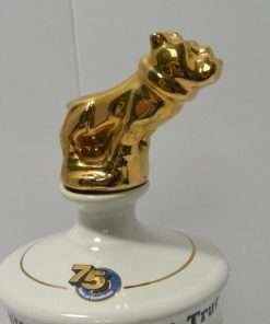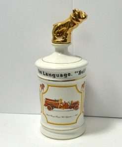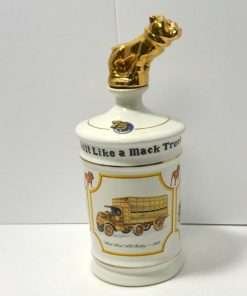 This vintage liquor decanter was created to celebrate the 75th anniversary of the Mack Truck. It features three different vehicles made by the company: the Mack AC Bulldog of 1916, the Mack 2-Ton Junior Model of 1913, and the Mack Rotary Pumper Fire Apparatus of 1911. Along the top it reads: “It’s Part of the Language.” “Built Like a Mack Truck.” Best of all, the iconic Mack Bulldog, painted gold, forms the top of the decanter. This decanter was the first issue, of a limited edition, commemorative, collector’s item. It is in excellent condition, and it is a full 10 3/4″ tall x 4″ in diameter.