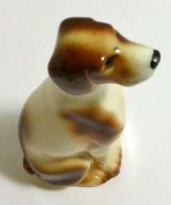 He measures 7 1/2″ tall x 2 1/4″ long x 2″ wide. He is beautifully colored in shades of brown and tan, against a creamy white base, with deep set, dark eyes.