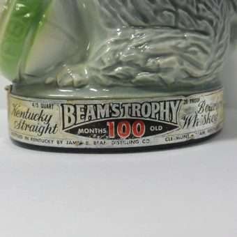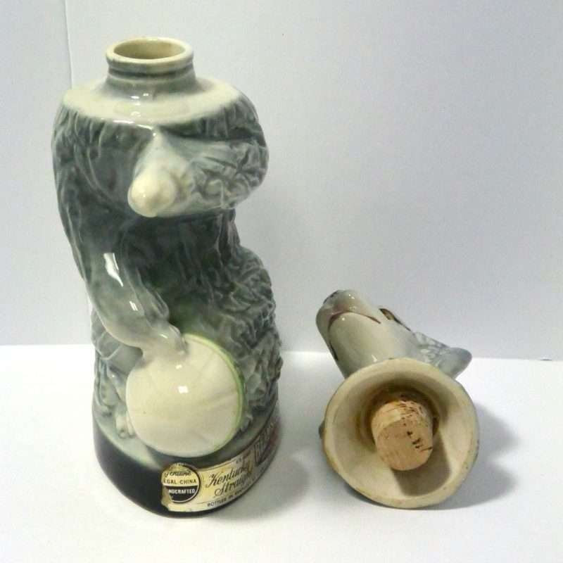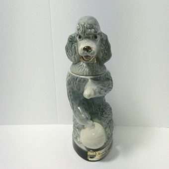 Everything that goes onto a bar doesn’t have to look masculine! Here, we are helping you break that trend with a wonderful, vintage Jim Beam, poodle decanter that is one part bourbon and three parts PIZAZZ! Penny, a charming gray poodle, is a collectible liquor decanter made by the Regal China Corporation, for Jim B. Beam in 1970. She is in good vintage condition, with the remains of the original labels along the base of the decanter, and down her back. Much of the original gold paint has been rubbed off of her collar. She is still a beauty, and although she is empty (bourbon not included), she holds 36.5 ounces of whatever you might choose! She stands 12″ tall x 6″ wide, and would make a fabulous addition to any poodle-lovers home, and a great gift to add a touch of “feminine” to a girlfriend’s bar!