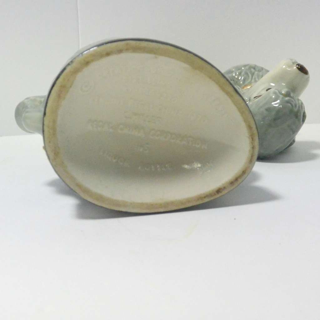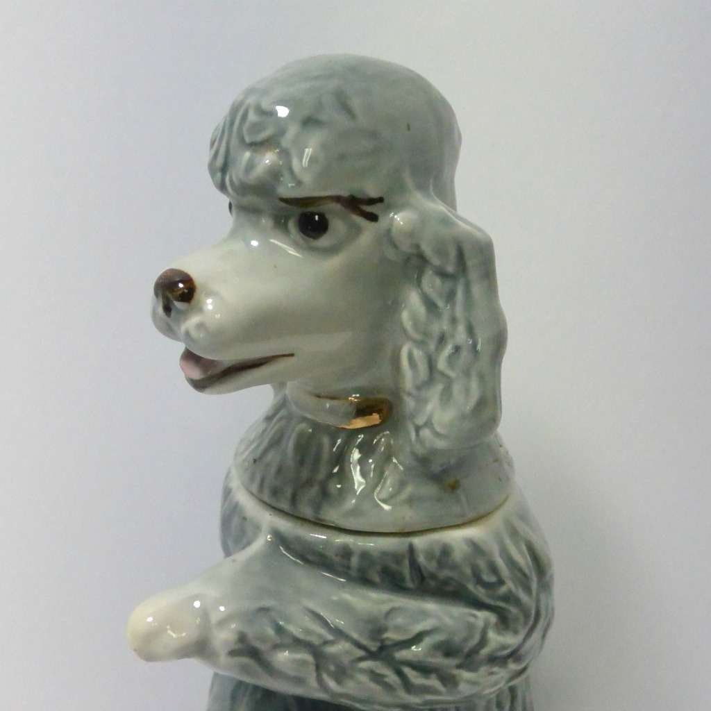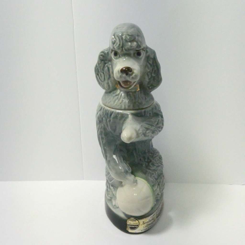 Everything that goes onto a bar doesn’t have to look masculine! Here, we are helping you break that trend with a wonderful, vintage Jim Beam, poodle decanter that is one part bourbon and three parts PIZAZZ! Penny, a charming gray poodle, is a collectible liquor decanter made by the Regal China Corporation, for Jim B. Beam in 1970. She is in good vintage condition, with the remains of the original labels along the base of the decanter, and down her back. Much of the original gold paint has been rubbed off of her collar. She is still a beauty, and although she is empty (bourbon not included), she holds 36.5 ounces of whatever you might choose! She stands 12″ tall x 6″ wide, and would make a fabulous addition to any poodle-lovers home, and a great gift to add a touch of “feminine” to a girlfriend’s bar!