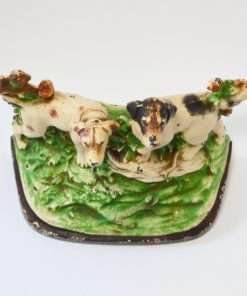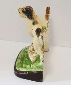 This wonderful Hubley cast iron bookend features a pair of Sporting dogs, one Pointer and one Setter, poised and alert, against a background of bright green grass and shrubbery, and a stone wall.