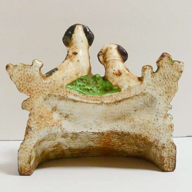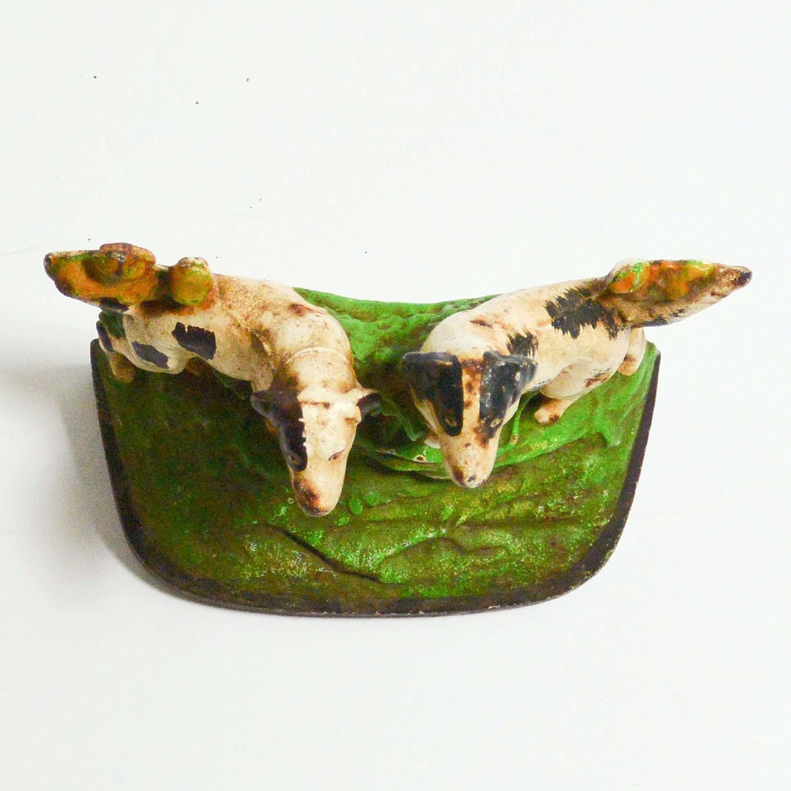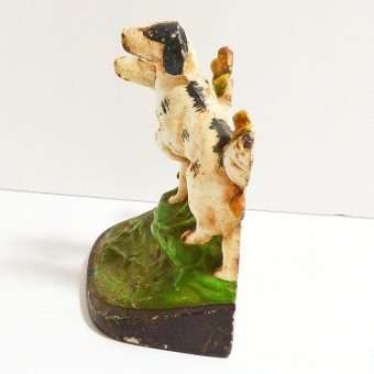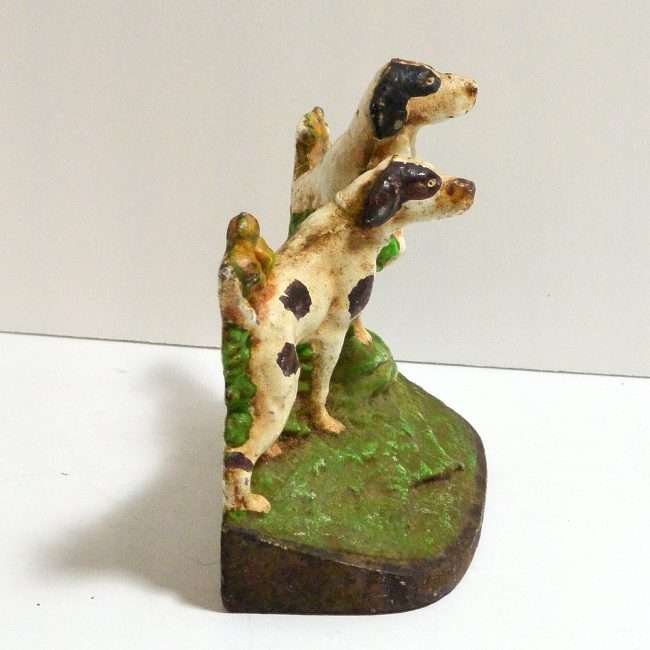 This wonderful Hubley cast iron bookend features a pair of Sporting dogs, one Pointer and one Setter, poised and alert, against a background of bright green grass and shrubbery, and a stone wall.