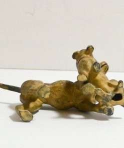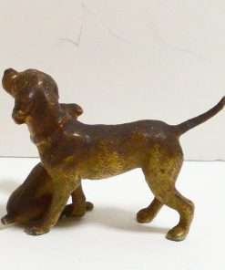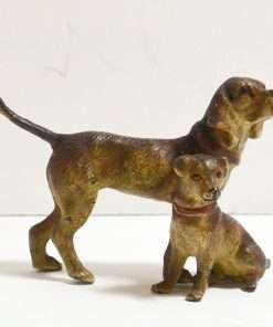 Measuring 2 3/4″ tall x 3 3/4″ long x 2″ wide, they look really good for their age. While the larger dog, perhaps a Pointer or a Retriever, has a bit of missing paint on his face, it certainly fits into the story of two “ruff” and tumble buddies, that perhaps this wonderful dog figurine tells.