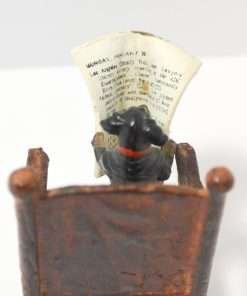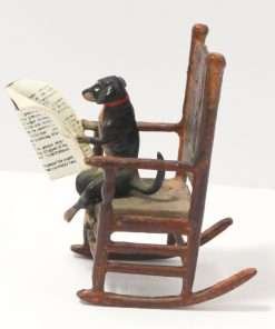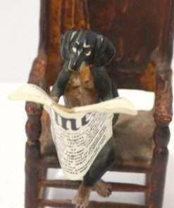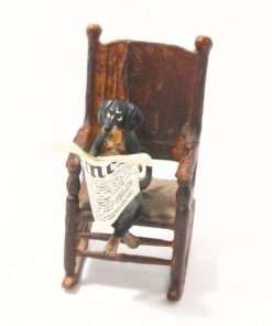 This miniature, cold painted Austrian bronze Dachshund is comfortably sitting on a rocking chair while reading the newspaper.