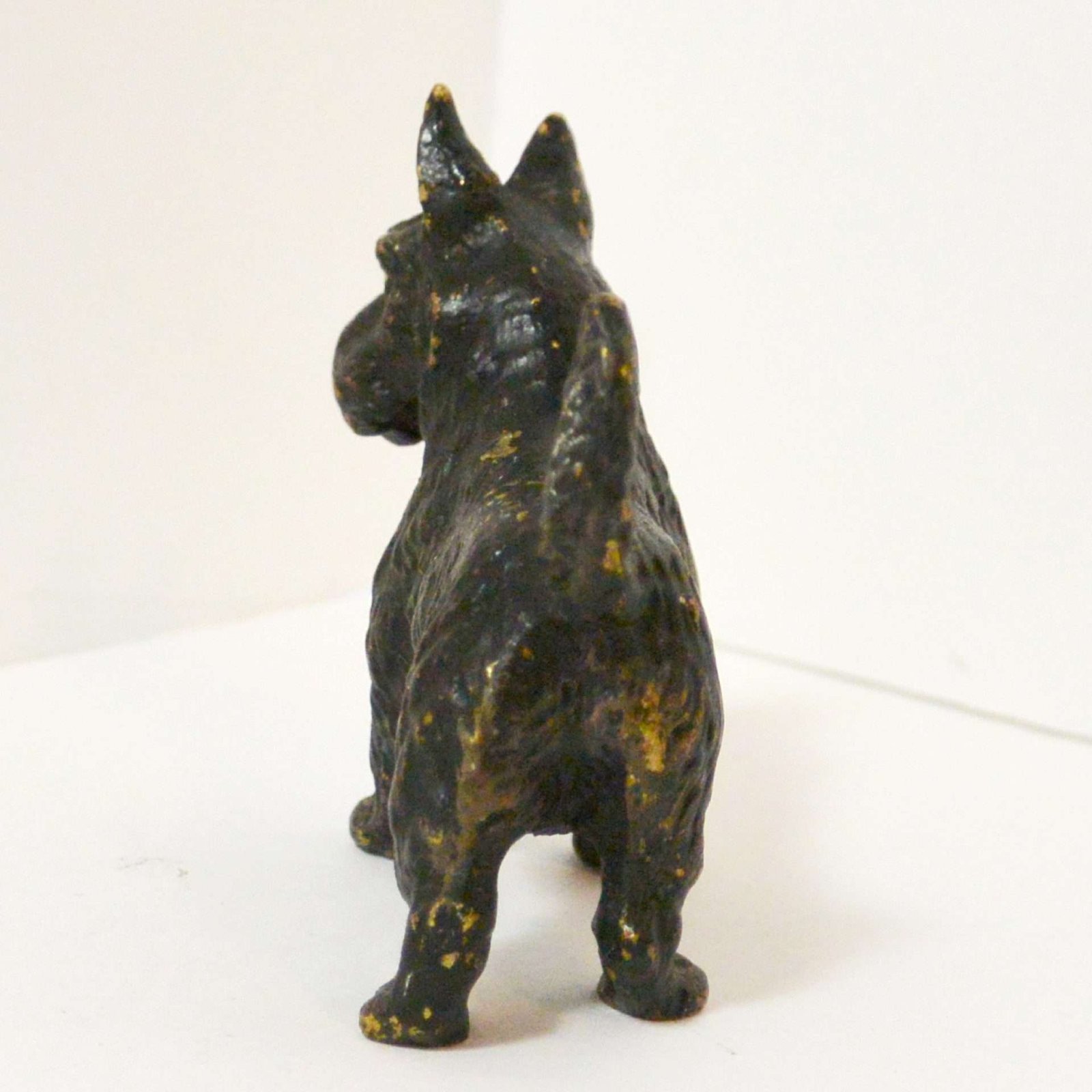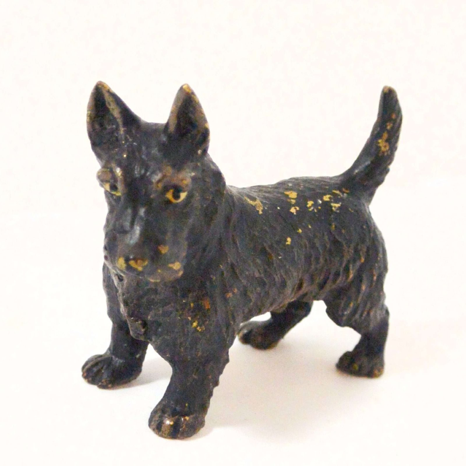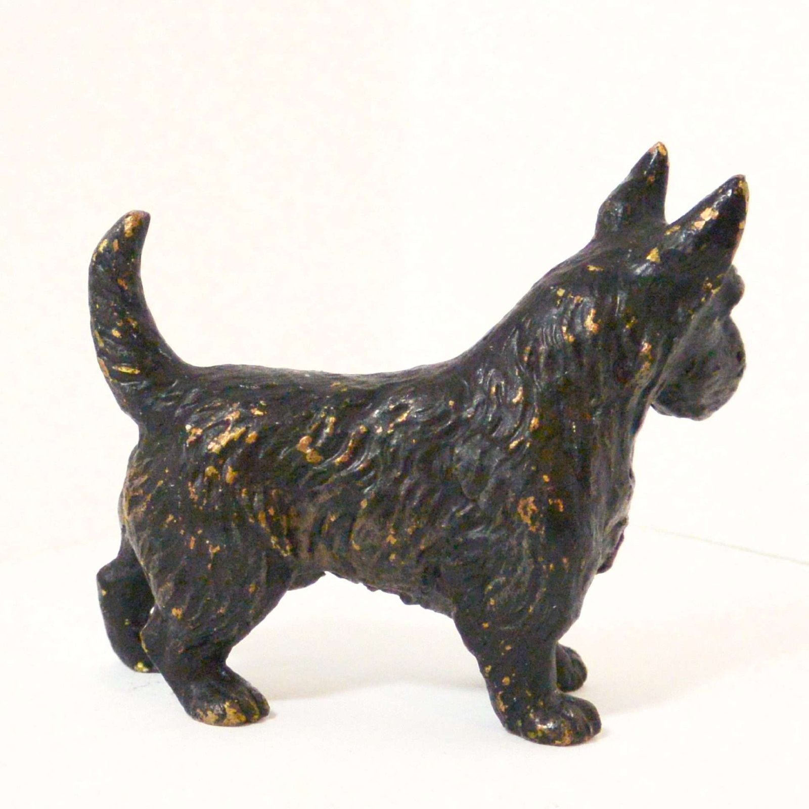 This Scottie dog looks as though he was first painted a metallic gold, and then painted black. So now, that in those tiny spots where his black paint has worn off, you see a glimmer of the underlying gold.