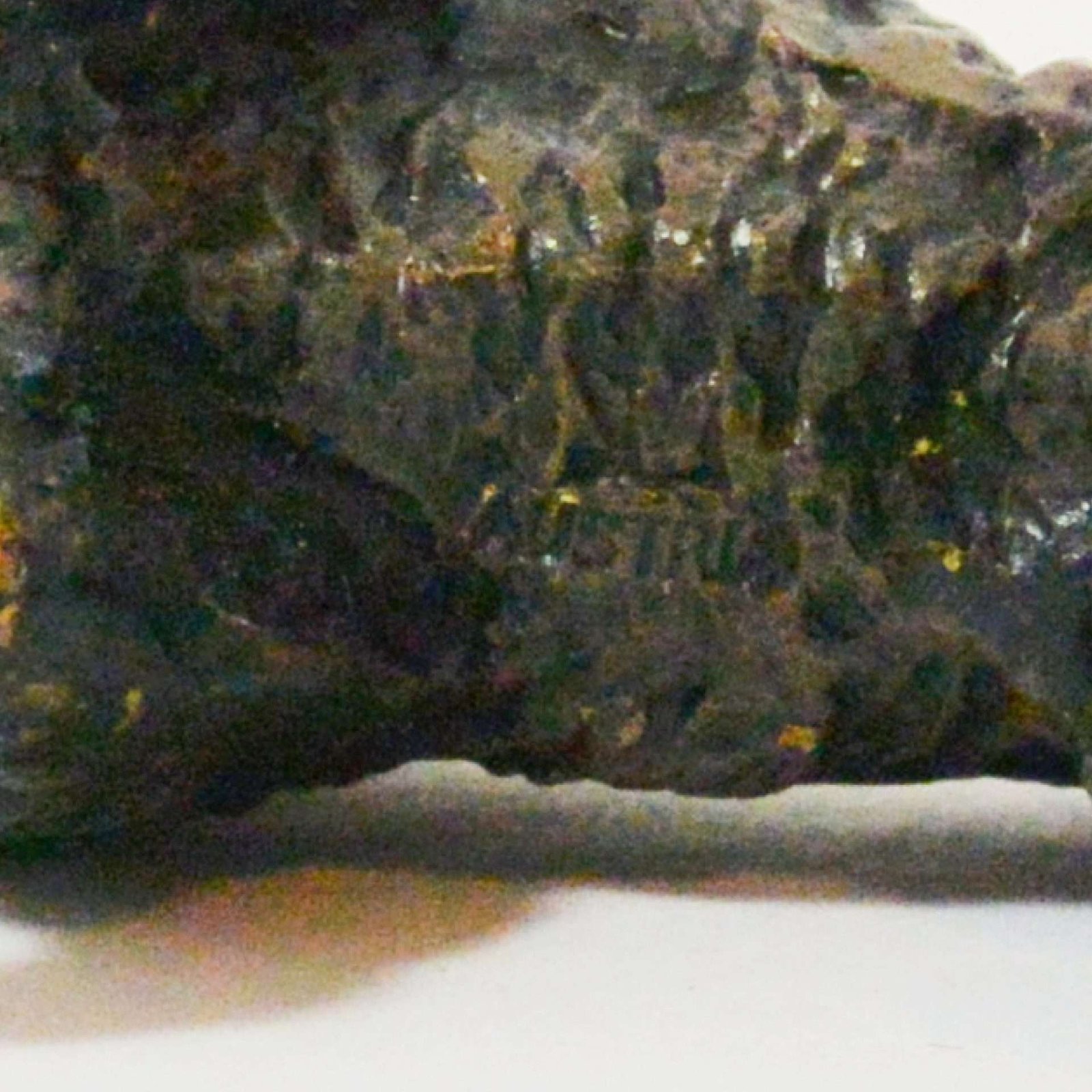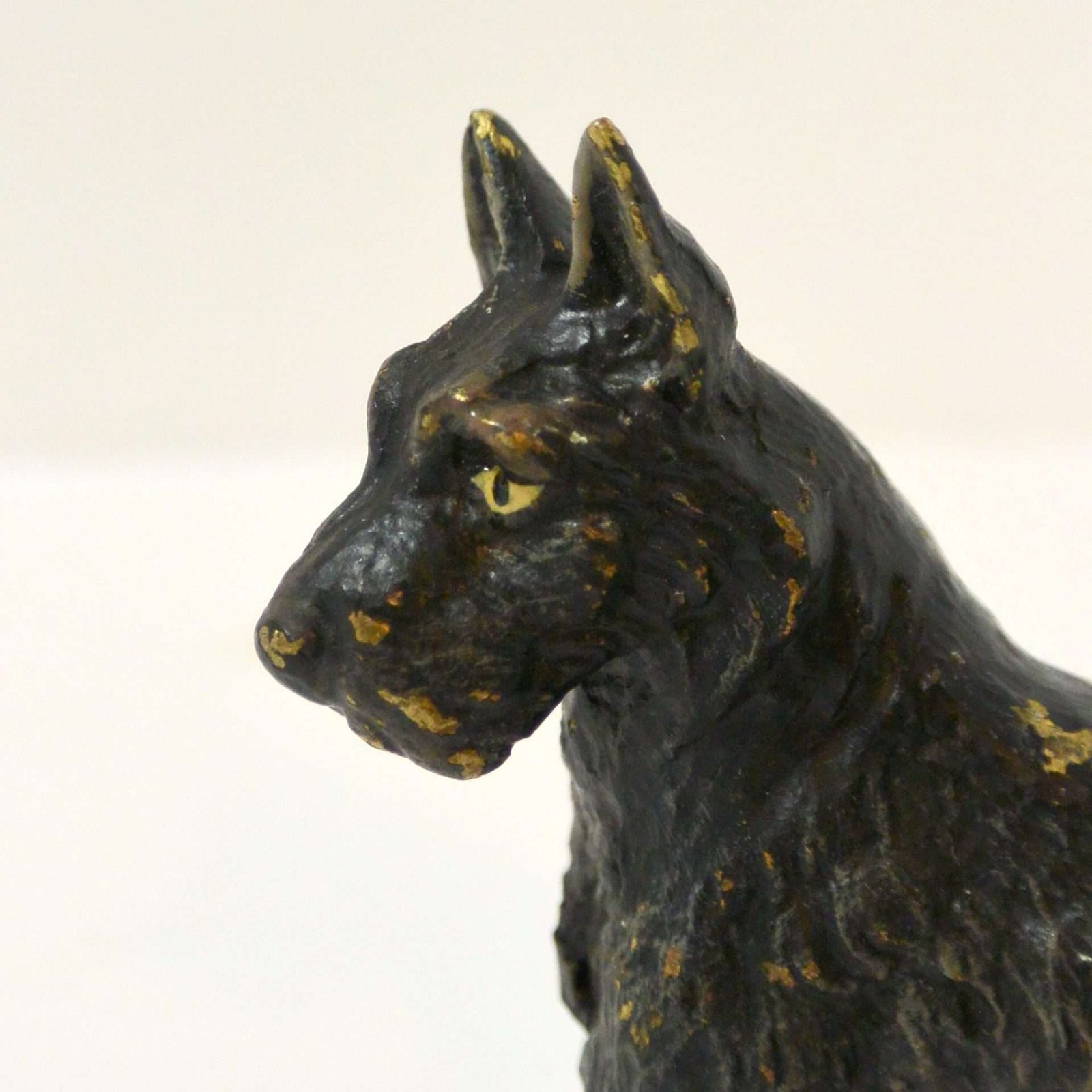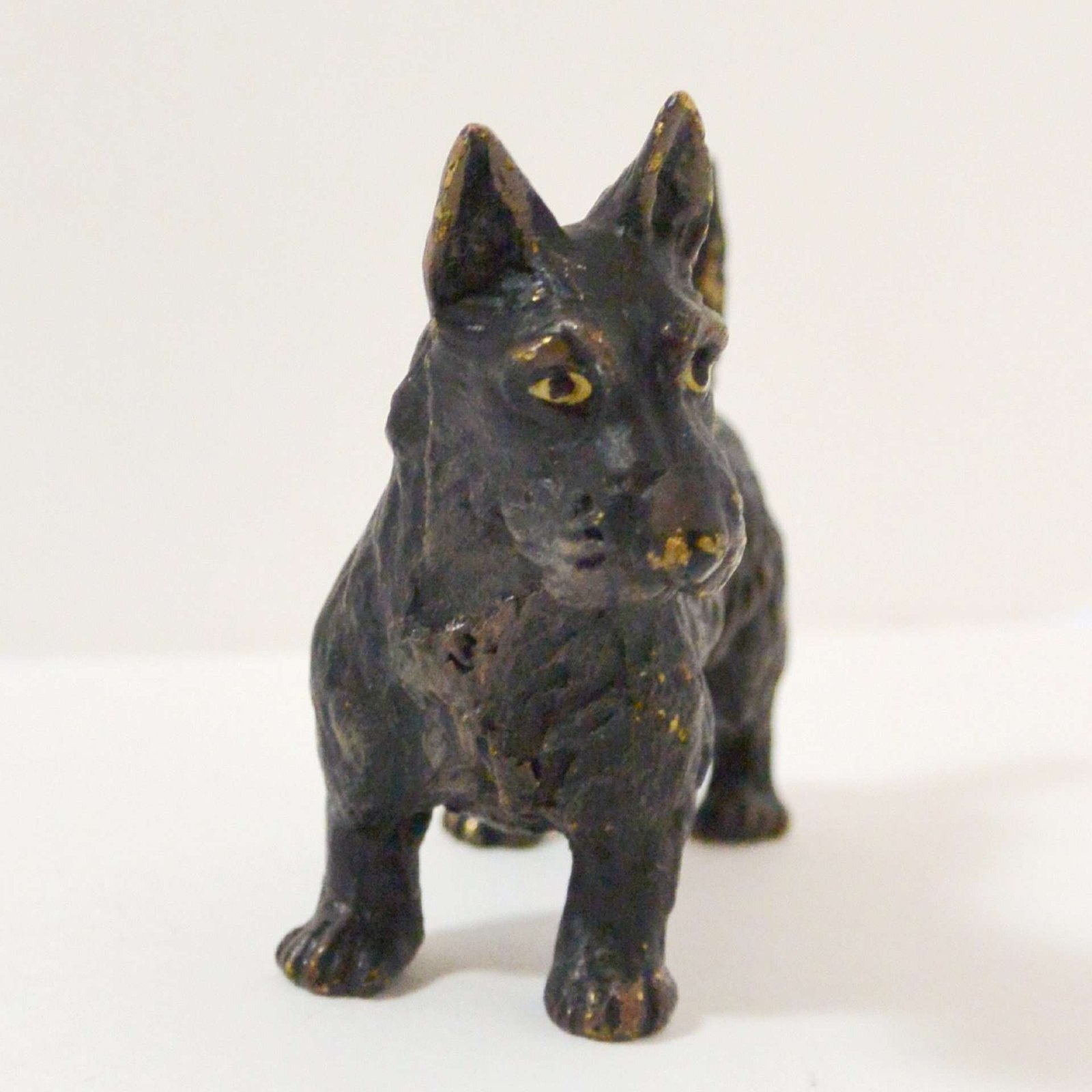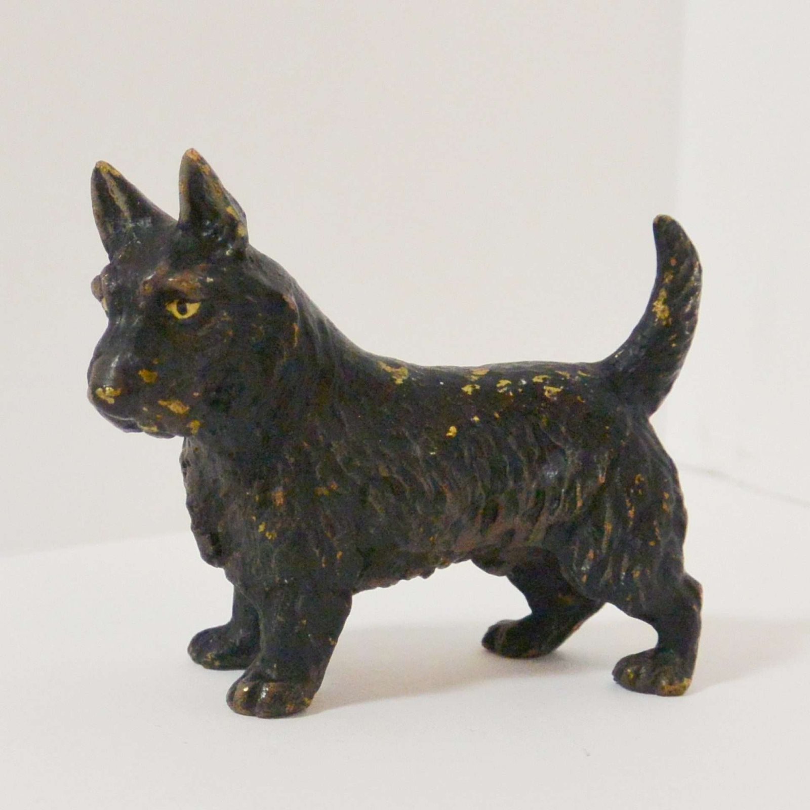 This Scottie dog looks as though he was first painted a metallic gold, and then painted black. So now, that in those tiny spots where his black paint has worn off, you see a glimmer of the underlying gold.
