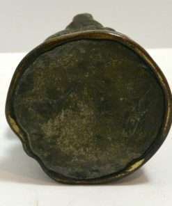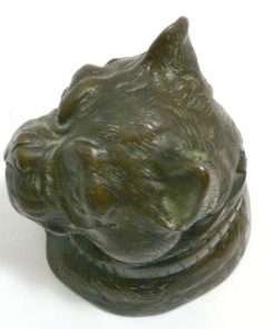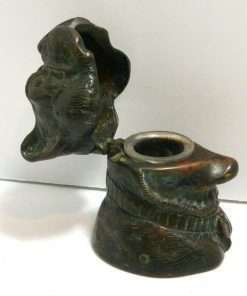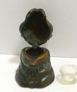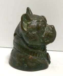 This distinguished fellow is an antique bronze inkwell. He looks to be a well-dressed Pug dog, sporting a fancy shirt collar, as well as a linked collar. He is highly-detailed, from his extravagant attire, to an abundance of fur lines, as well as the amazed look on his face. He has a hinged lid so that when his head is tilted back, he reveals the inkwell that has a removable glass insert. At 4″ tall x 3″ long x 2 1/2″ wide, he is small but very heavy due to the lead in his base, that can be seen from his underside. He is in excellent condition. He is a unique and excellent find for both a collector of antique inkwells, as well as a dog enthusiast. On your desk, not only would he add a touch of “class”, he looks as though he might be a good listener too.