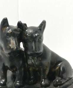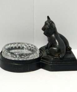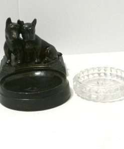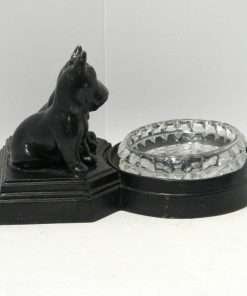 Measuring 3 3/4″ tall x 6 1/2″ long, with a circular tray that is 3 1/2″ in diameter, this wonderful, decorative piece is in great condition, with minor paint loss on the Scotties. It was made in the mid-to-late 1920’s.