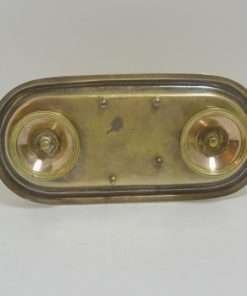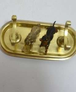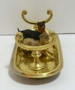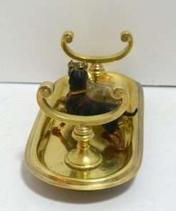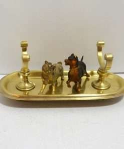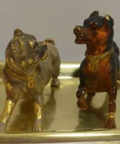 This wonderfully unique, antique pen stand was made by combining an antique Victorian quill pen stand and tray with two cold-painted bronze dogs. While the tray dates back to between 1860-1870’s, the dog pair, which look to be a Terrier and a Pug, are Bergman, dating them to around the early 1900’s, when the entire piece seems to have been put together. It is 3″ tall x 7″ long x 3 1/2″ wide and it is in great, antique condition. There is some paint lose on the dogs, which is expected, considering their age. The tray is brass, and it has two pedestal , flanged feet. The dogs look as though they have just happened upon each other and are ready to romp. This whimsical encounter adds tremendous charm to this elegantly designed desk accessory.