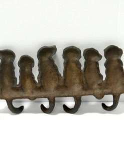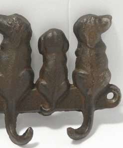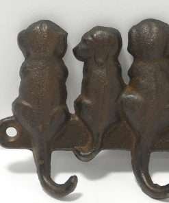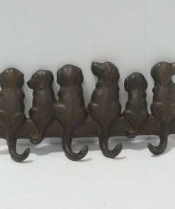 This fabulous, cast iron wall hook features six puppies seated all in a row. Each one is slightly different, although they all look to be Labrador Retriever puppies, or some very similar breed.