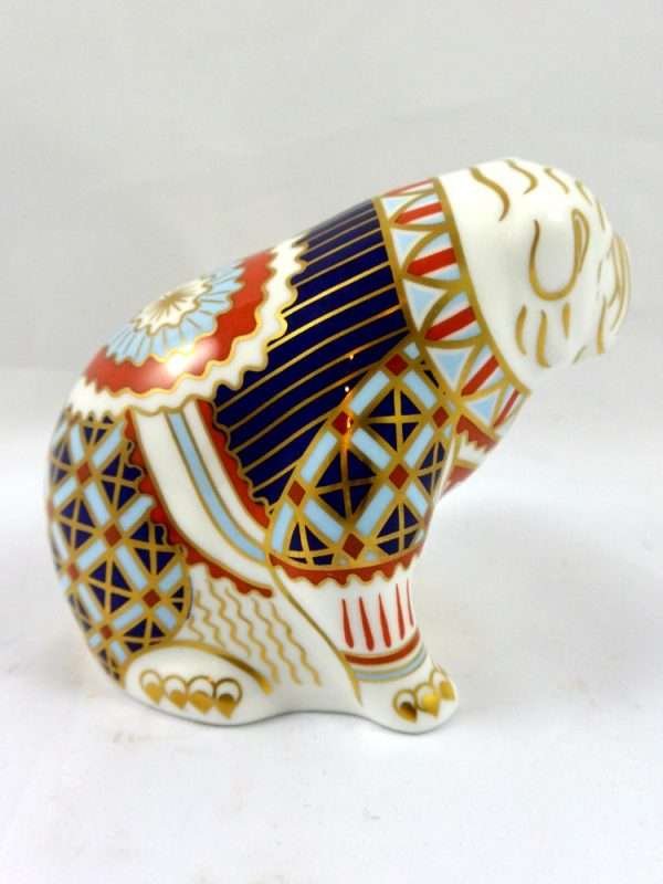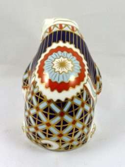 This elegant, Royal Crown Derby Bulldog paperweight is in excellent condition. It has the full Royal Crown Derby backstamp, and it is 3 1/2″ tall x 4″ long x 2 1/2″ wide. It was modeled by Robert Jefferson in 1991, and is done in a rich burnt red, navy blue, sky blue, and gold on a bright white background, which makes the intricate designs, which cover this Bulldog, really stand out. It would make a wonderful addition to a Bulldog collection, and an elegant holiday gift to any Bulldog lover.