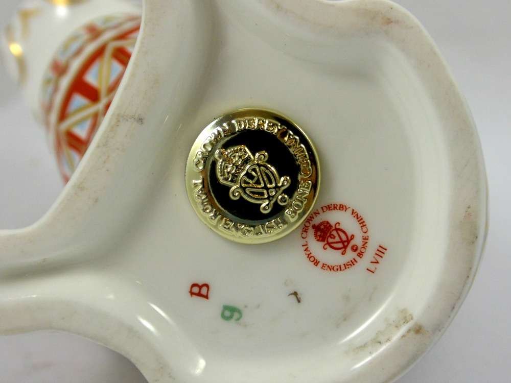 This elegant, Royal Crown Derby Bulldog paperweight is in excellent condition. It has the full Royal Crown Derby backstamp, and it is 3 1/2″ tall x 4″ long x 2 1/2″ wide. It was modeled by Robert Jefferson in 1991, and is done in a rich burnt red, navy blue, sky blue, and gold on a bright white background, which makes the intricate designs, which cover this Bulldog, really stand out. It would make a wonderful addition to a Bulldog collection, and an elegant holiday gift to any Bulldog lover.