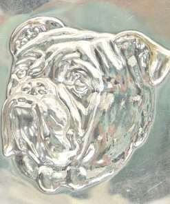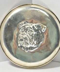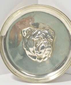 This sterling silver, Bulldog, portrait dish was created by the S.W. Smith & Company of London, England. It features a highly-detailed portrait of a Bulldog. The spectacular detailing of the dog’s droopy jowls and eyelids makes the portrait amazingly realistic, and almost encourages you to return the dog’s intent gaze.