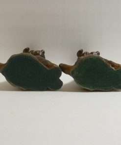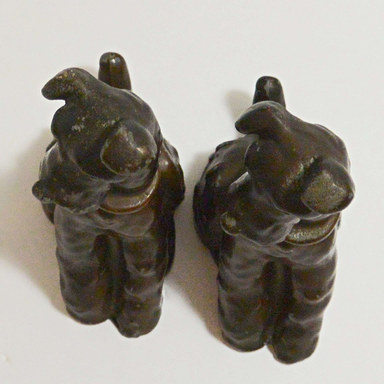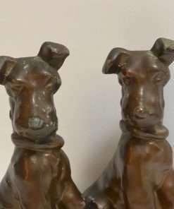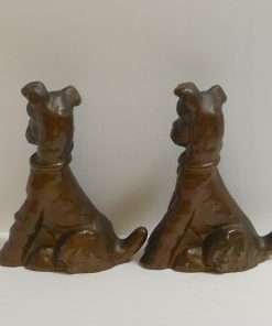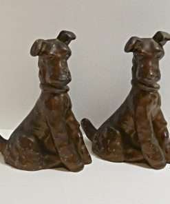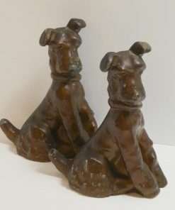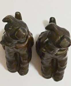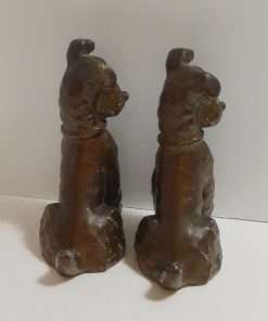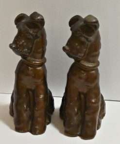 Made of spelter metal and then once coated in a glossy bronze paint, they measure 6 1/2″ tall x 5″ long x 2 1/2″ wide.