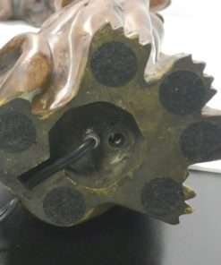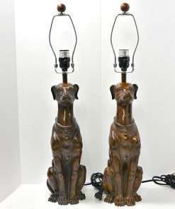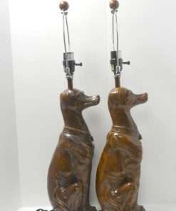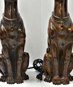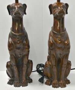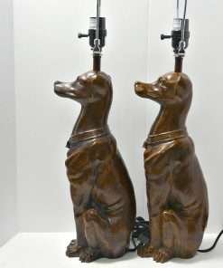 This elegant pair of wood table lamps are each a seated Whippet dog. They are large, measuring a full 15 1/2″ tall x 6″ long x 5″ wide, and quite heavy. The details are similar to those that you see in bronze figurines by Mene or Barye: detailed collars with bells, realistic paws, tails and musculature.