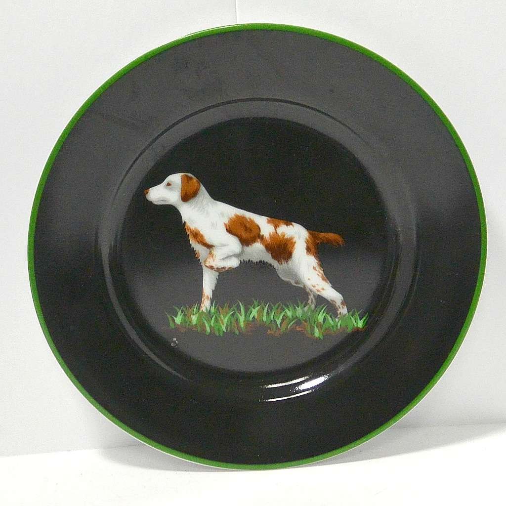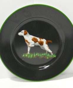 This sporting dog is beautifully and artistically detailed, with its bright white and liver fur contrasting exquisitely against the high gloss background of the plate.