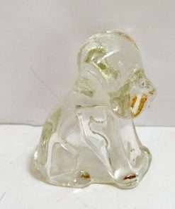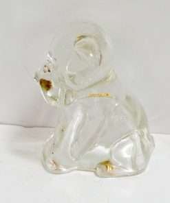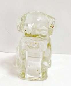 This set of five, pressed, clear glass pups are just waiting to become part of your glass collection or unique art project. Made by Federal Glass of Columbus, Ohio in the 1940’s, this figural pup was called “Mopey Dog”, and was filled with very tiny multi-colored candy balls.