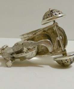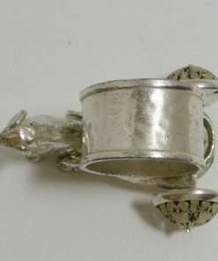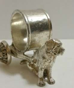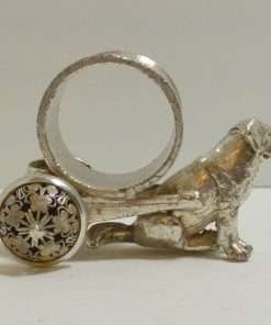 It certainly mirrors a classic Victorian style with heavy and glorious ornamentation. Measuring 2 3/4″ tall x 3 3/4″ long x 2 1/2″ wide, it has the highly-detailed Saint Bernard seated at the front of a flatbed wagon, that holds the napkin ring.