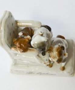 This whimsical porcelain Pug dog fairing, captures the mischievous spirit of three dogs, two of whom seem to have found their way onto the parlor furniture.