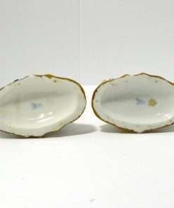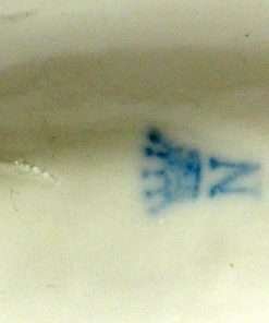 This pair of Staffordshire Poodle dogs is absolutely exquisite. Posing in a perfect bow, they measure 3″ tall x 4 1/4″ long x 2 1/2″ wide, They are highly and colorfully detailed from the soft white coloring of their bodies in contrast to the bright white abundance of curly fur that surrounds their heads, tails and legs. Likewise the “ground” at the base of each figurine has very realistic-looking, dark green tufts of moss. Each piece has a wide, gilded banding along the bottom edge. They are each marked with a gilded anchor, the Chelsea Porcelain Mark, as well as the blue, stamped crown with the letter “N”, which identifies them as being made by the Ernst Bohne Sons factory in Rudolstadt, Germany between 1878 – 1920.