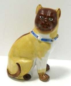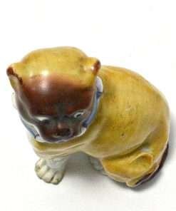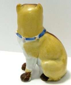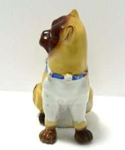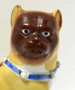 This antique, porcelain Pug dog is seated with open front legs. He is wearing a bright blue, ribbon collar with bells. He is a beautiful fawn color with white and dark brown accents. Referred to as a “Cat Face” Pug, he also has a loosely curled “cat-like” tail, unlike the typically, tightly curled tail on other Pug porcelain figurines.