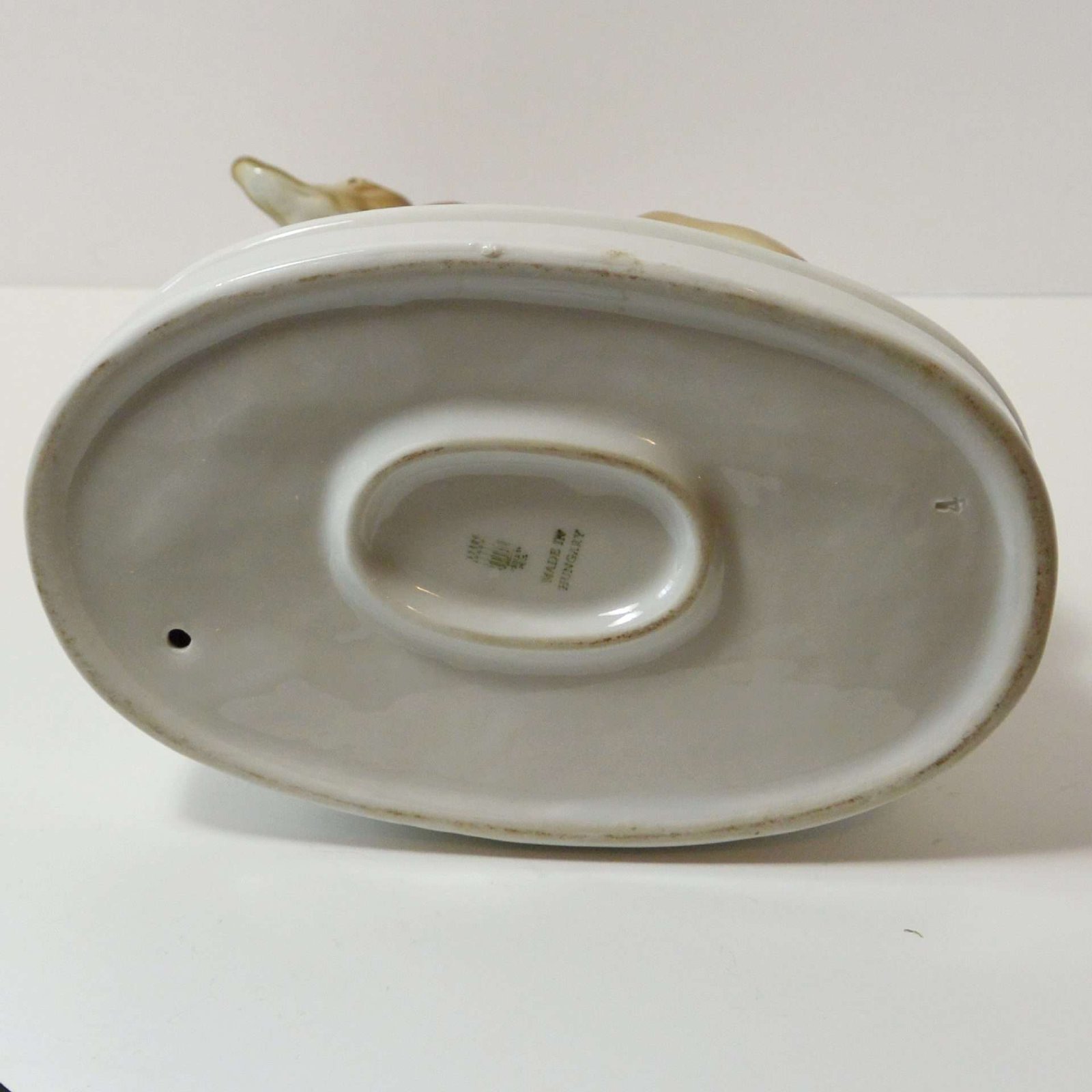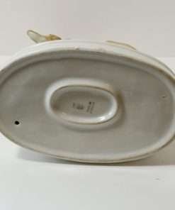 Hand-painted in soft hues of brown and creamy white, with a muted green topped oval plinth, this gorgeous dog measures a full 10 1/4″ tall x 7 3/4″ long x 4 3/4″ wide.