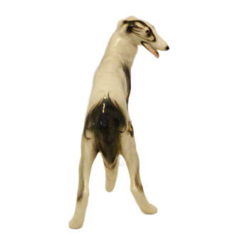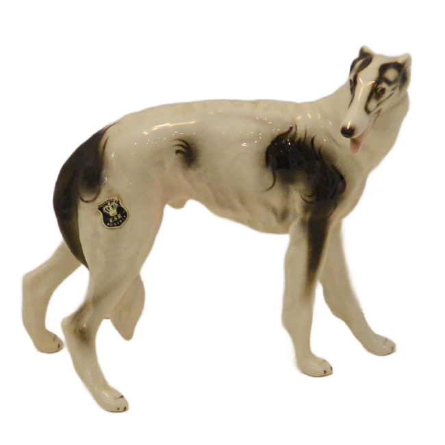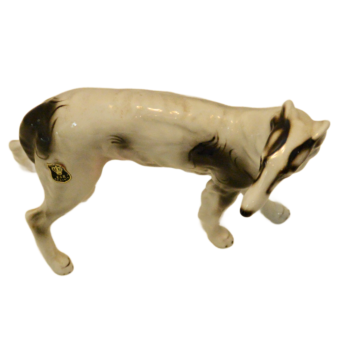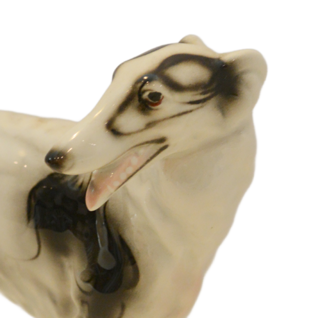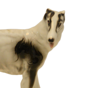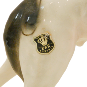 Hand-painted with striking black markings against a crisp white glaze, this Russian Wolfhound is captured in a graceful, lifelike stance. The fine detail in the face—including the breed’s characteristic slender muzzle and gentle expression—showcases the high-quality craftsmanship of the Austrian porcelain houses of the era.