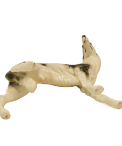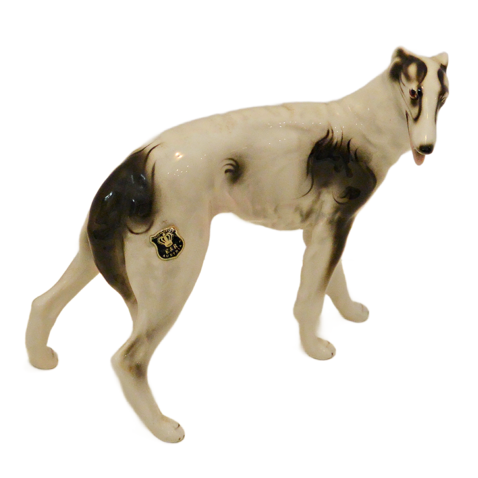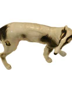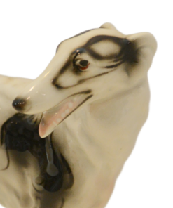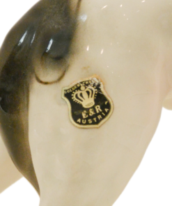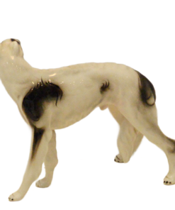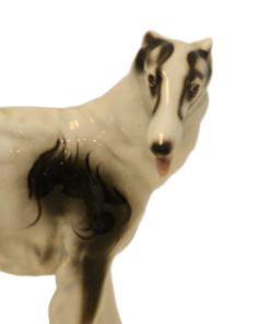 Hand-painted with striking black markings against a crisp white glaze, this Russian Wolfhound is captured in a graceful, lifelike stance. The fine detail in the face—including the breed’s characteristic slender muzzle and gentle expression—showcases the high-quality craftsmanship of the Austrian porcelain houses of the era.