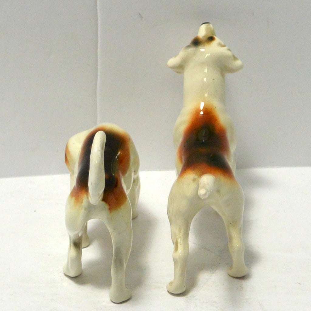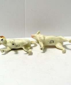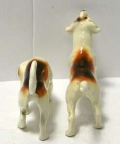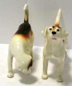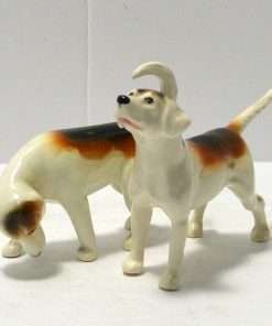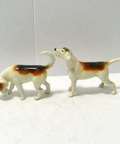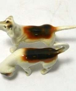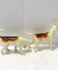 Both foxhounds are in excellent condition and well-marked on their undersides. The Foxhound with his head up measures 3″ tall x 4 1/4″ long x 1 1/4″ wide. The Foxhound with his head down and slightly tilted to one side measures 2 3/4″ tall x 3 1/2″ long x 1 1/4″ wide.